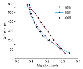 CHEF Mapper 系統(tǒng)的非線性轉(zhuǎn)換時間梯度的遷 移效果。分子大小對線性、凹形、凸形梯度的 遷移。凸形梯度產(chǎn)生的線性跨度最寬。