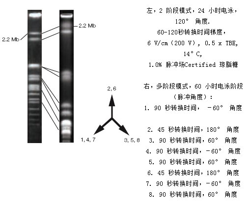 多階段(脈沖角度)模式的高分辨率分離。 S. cerevisiae 染色體在2 階段條件(左)和多階段條件(右)下分離。 注意多階段條件下的共遷移染色體的分離。