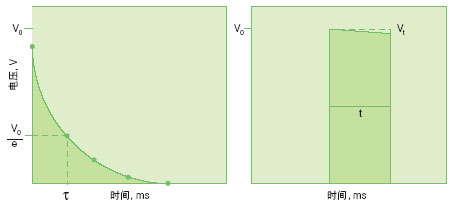 左,指數(shù)衰變脈沖。當(dāng)一個(gè)充電至電壓為V 0 的電容器放 電到細(xì)胞,加在細(xì)胞上的電壓隨時(shí)間以指數(shù)方式下降。從 起始電壓下降到V0 / e 所需的時(shí)間稱為為時(shí)間常數(shù)τ, 一 種方便的脈沖時(shí)間表達(dá)方式。 右,方波脈沖。放電到樣品后截?cái)嚯娙萜髅}沖可產(chǎn)生方 波脈沖。脈沖時(shí)間為細(xì)胞被放電的時(shí)間。所有方波設(shè)備都 會(huì)產(chǎn)生細(xì)微的電壓下降。這種電壓下降稱為脈沖下垂,并 以起始電壓的百分比計(jì)量。